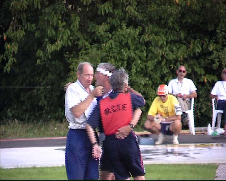 The first round of semis save the favourites Ross/Turner disqualified when Malcolm Ross fell out of the circle on his first landing. It was a difficult decision for the jury as a major cause was the wandering off centre by all pilots making it difficult to get round the outside and Malcolm felt he had been pushed out of the circle. However, with no clear evidence either way, the jury had not alternative but to disqualify him for having a foot out before the model was in the pitmans hand. (an important safety rule !) The only really quick time of this round was a 3:20.4 from Titov/Yugov with Langworth/Campbell being over 5 seconds behind.