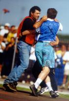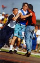 Round 3 was a good round for the British contingent with all three flyers winning their bouts. Mervyn Jones had an easy win with cuts and ground time against Gunther Staffel (AUT) and Peter Grange had victory against Kimmo Valkonen (FIN) due to excessive ground time. Mike Whillance had the difficult draw in this round – flying against Vadim Arifov (RUS) and in the first attempt both flyers took each others streamers in one pass and were initially instructed by the circle marshal to fly level. There then followed a confusing 30 seconds when the flyers were incorrectly instructed to "combat" and Mike’s model was damaged. A refly was then granted, as should have been the initial case, but it was a pity a model was wasted in the process. In the refly Mike won with a quick 2 to 1 victory by attacking from the start and achieving a very useful victory.